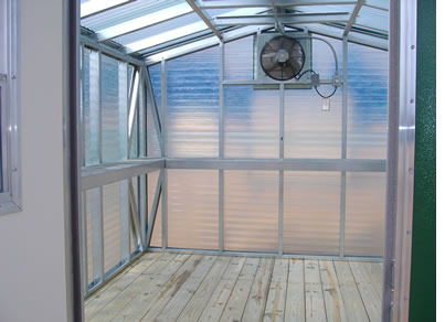 All units are standard without a floor that enables you to use bark, gravel, or whatever you think best absorbs the water that is used when you water your plants. We also offer two or three different flooring systems upon your request. All units are standard with wiring in 1/2" EMT conduit with lights and receptacles, wire mesh shelving on three walls and a 32" mobile home-type door with window for extra ventilation. Options include thermostat controlled exhaust fans and sprinkler systems.